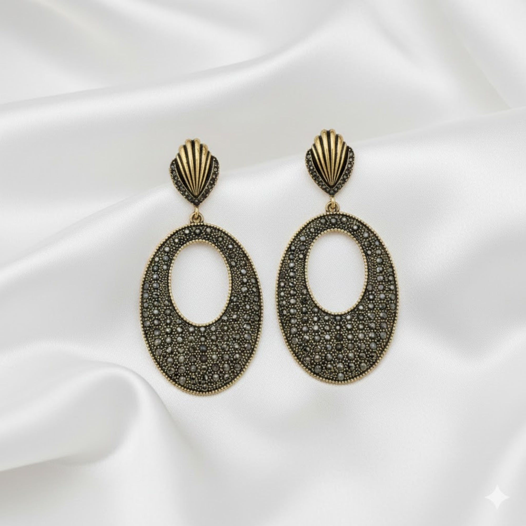 Inspired by vintage artistry and bold feminine charm, these Antique Gold Oval Drop Earrings are designed for women who love to make a powerful style statement. The elegant fan-shaped top paired with a large textured oval dangler reflects confidence, heritage, and contemporary fashion coming together in one striking accessory.