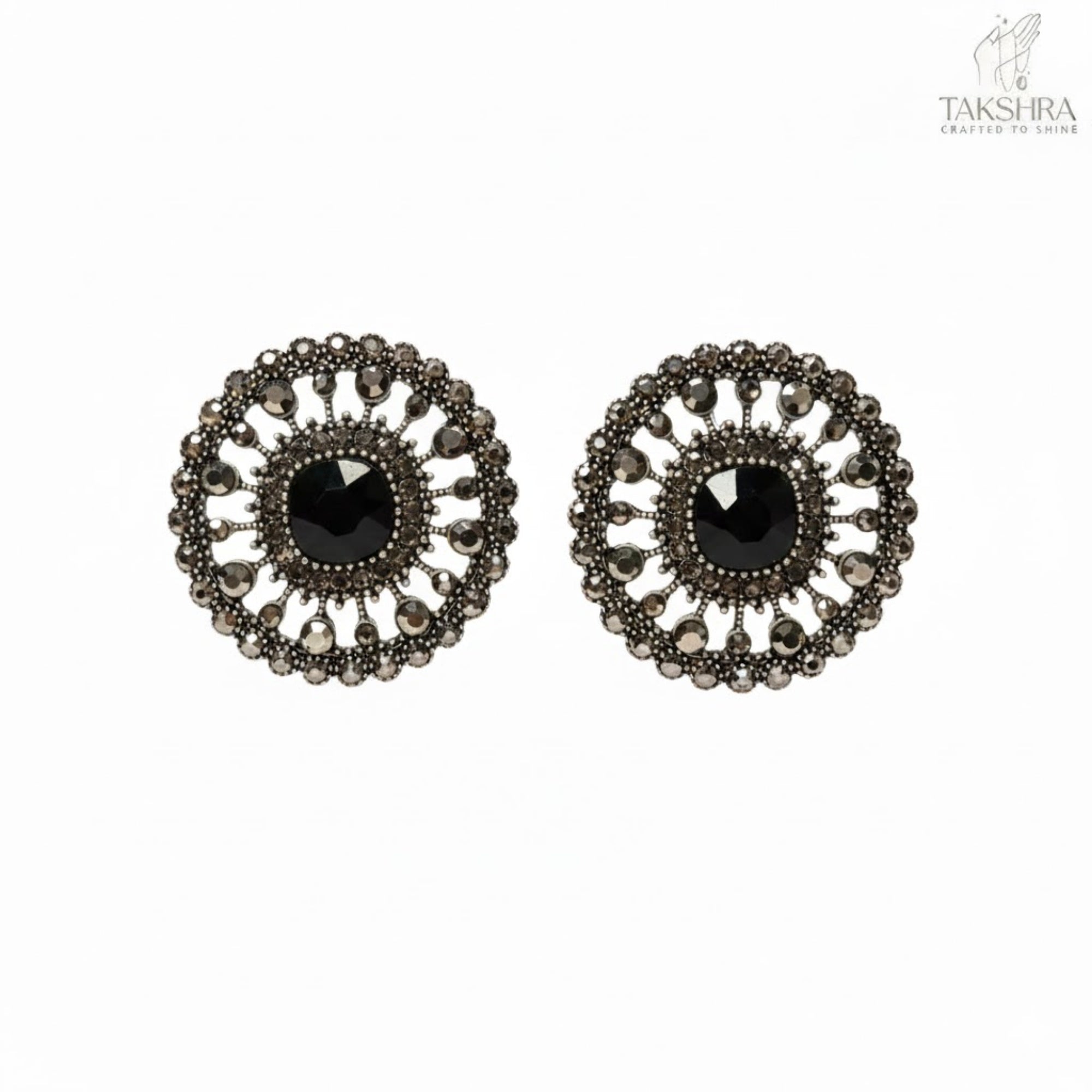 These statement stud earrings feature a striking round design highlighted with an elegant black stone at the center. Surrounded by detailed antique silver beading, the earrings create a dramatic look while remaining lightweight and comfortable for long wear.