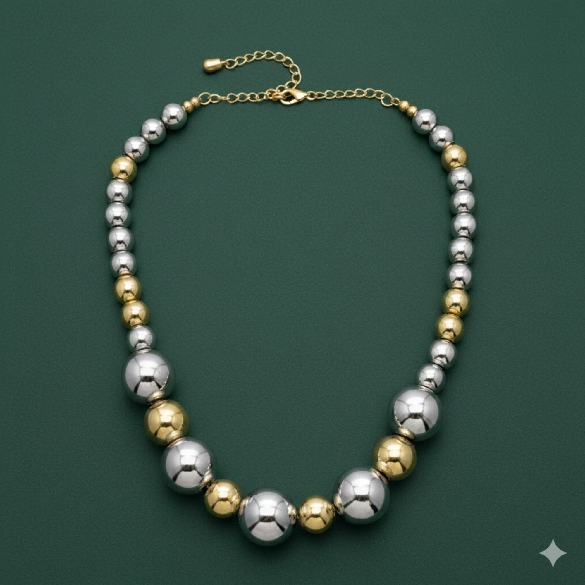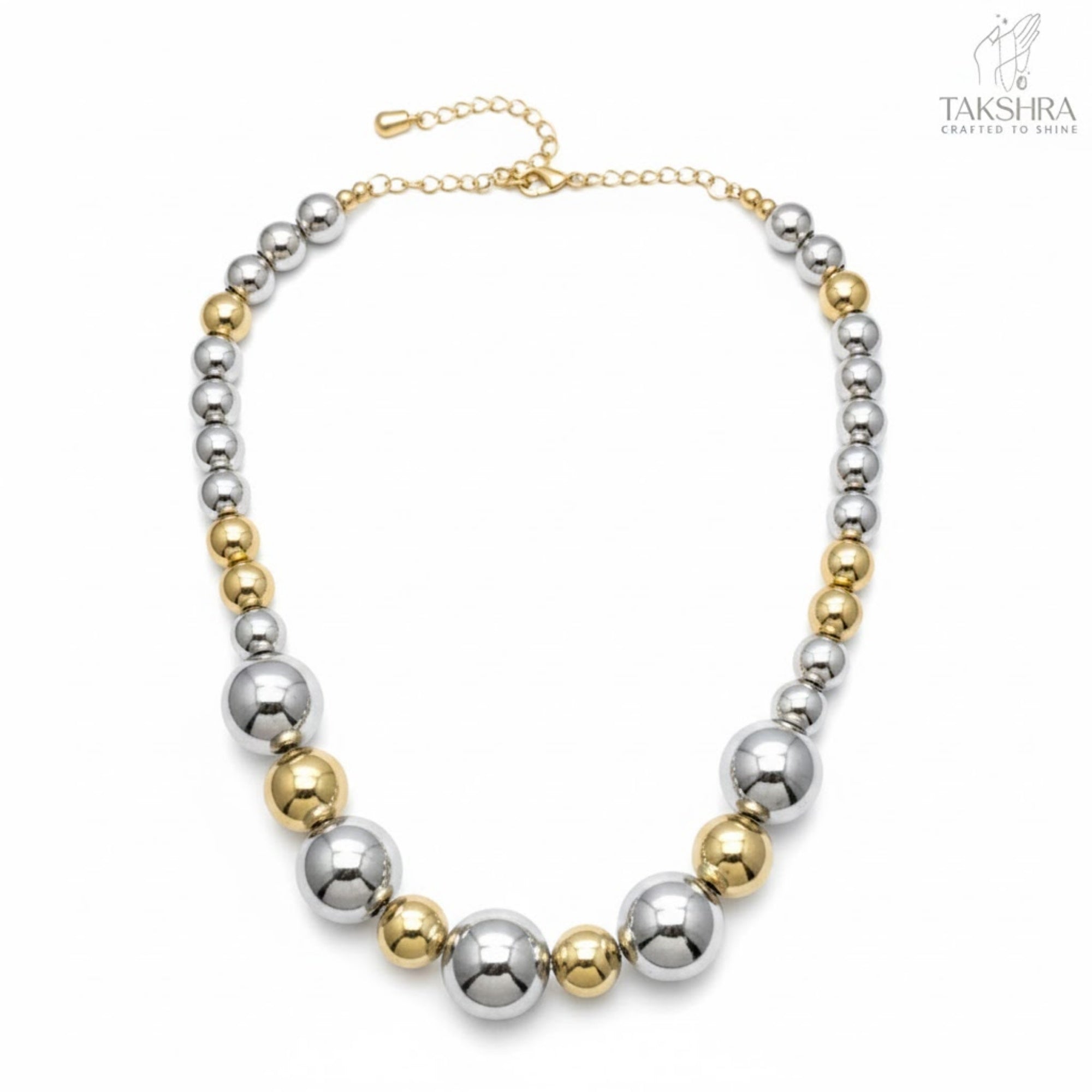 Inspired by the harmony of contrast, this Dual-Tone Metallic Beaded Necklace celebrates the fusion of warm gold tones and cool silver hues. It symbolizes balance, sophistication, and effortless versatility. Designed for women who love bold yet refined accessories, it adds instant radiance to both contemporary and traditional looks.