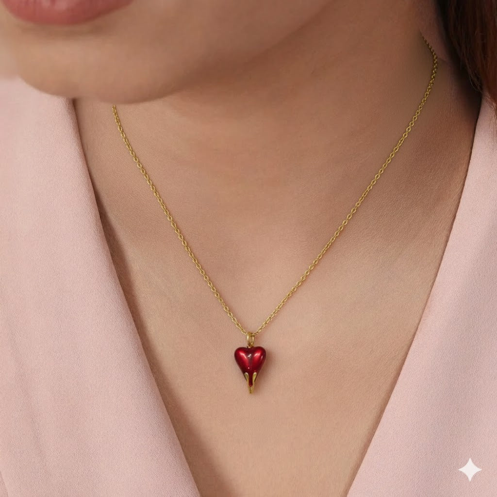 Inspired by the bold language of modern love and self-expression, this red drip heart pendant symbolizes passion, confidence, and individuality. Designed for those who love playful yet statement jewellery, it blends a glossy red enamel heart with a sleek gold finish — perfect for expressing emotions in style.