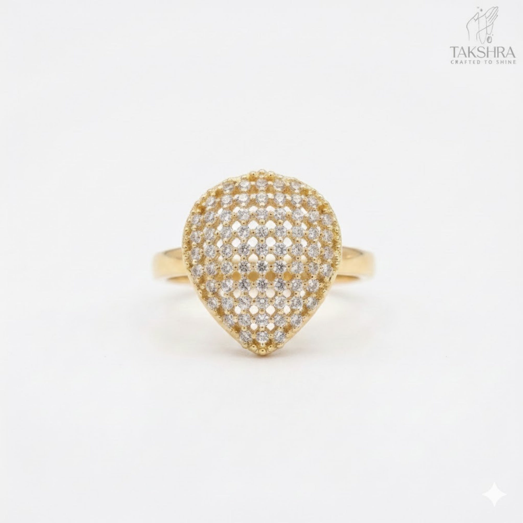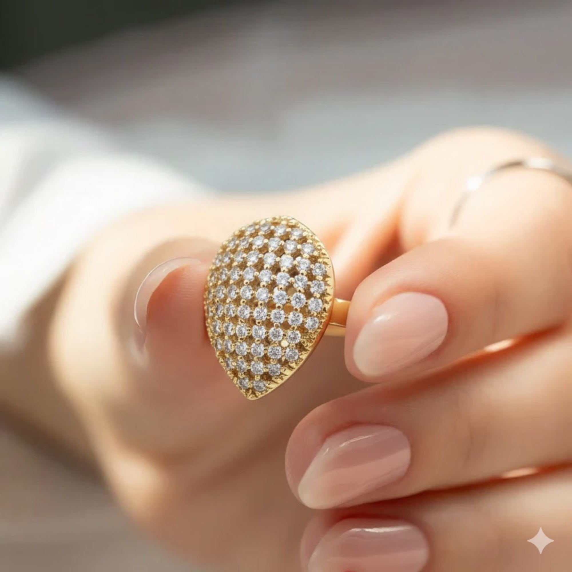 This stunning statement ring features a teardrop-shaped dome design fully studded with shimmering crystal stones arranged in a clustered pavé pattern. Finished in luxurious gold plating, it offers a premium look while being lightweight and comfortable for everyday elegance.